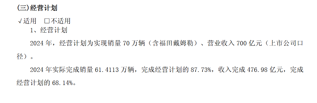 2024年祥富金融,福田汽车制定的经营计划为实现销量70万辆(含福田戴姆勒)、营业收入700亿元(上市公司口径)。2024年实际完成销量61.4万辆,完成经营计划的87.73%;收入完成476.98亿元,完成经营计划的68.14%。