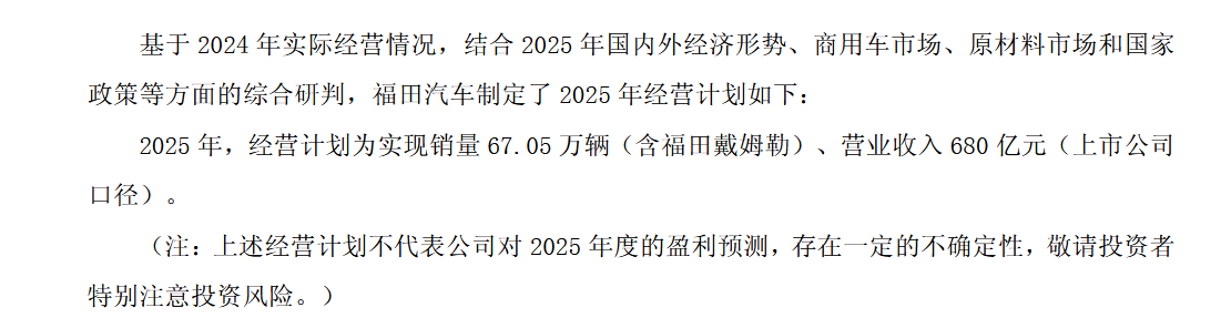 尽管如此,福田汽车2025年经营计划为实现销量67.05万辆(含福田戴姆勒),营业收入680亿元(上市公司口径)。公司强调相关经营计划不代表公司对2025年度的盈利预测,存在一定的不确定性,请投资者特别注意投资风险。