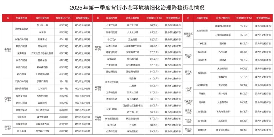 按照《深入推进背街小巷环境精细化治理三年(2023-2025年)行动方案》,2025年第一季度,市城市管理委联合首都文明办、市规划自然资源委等部门组织第三方机构对北京市背街小巷开展专项检查。
